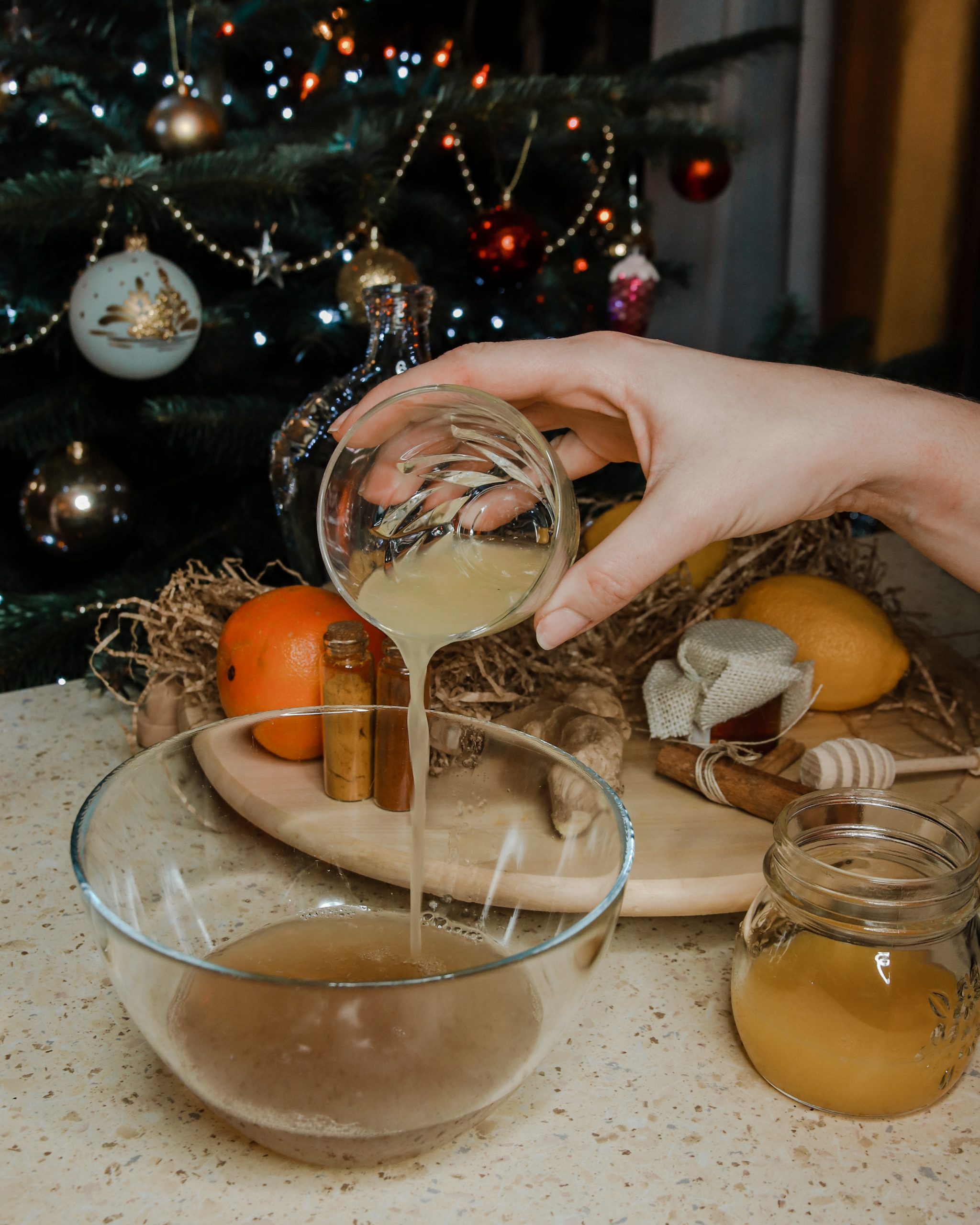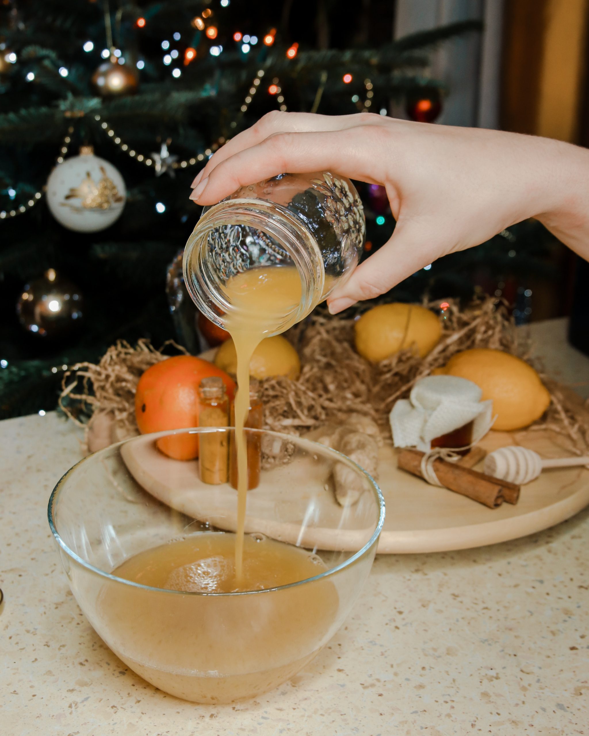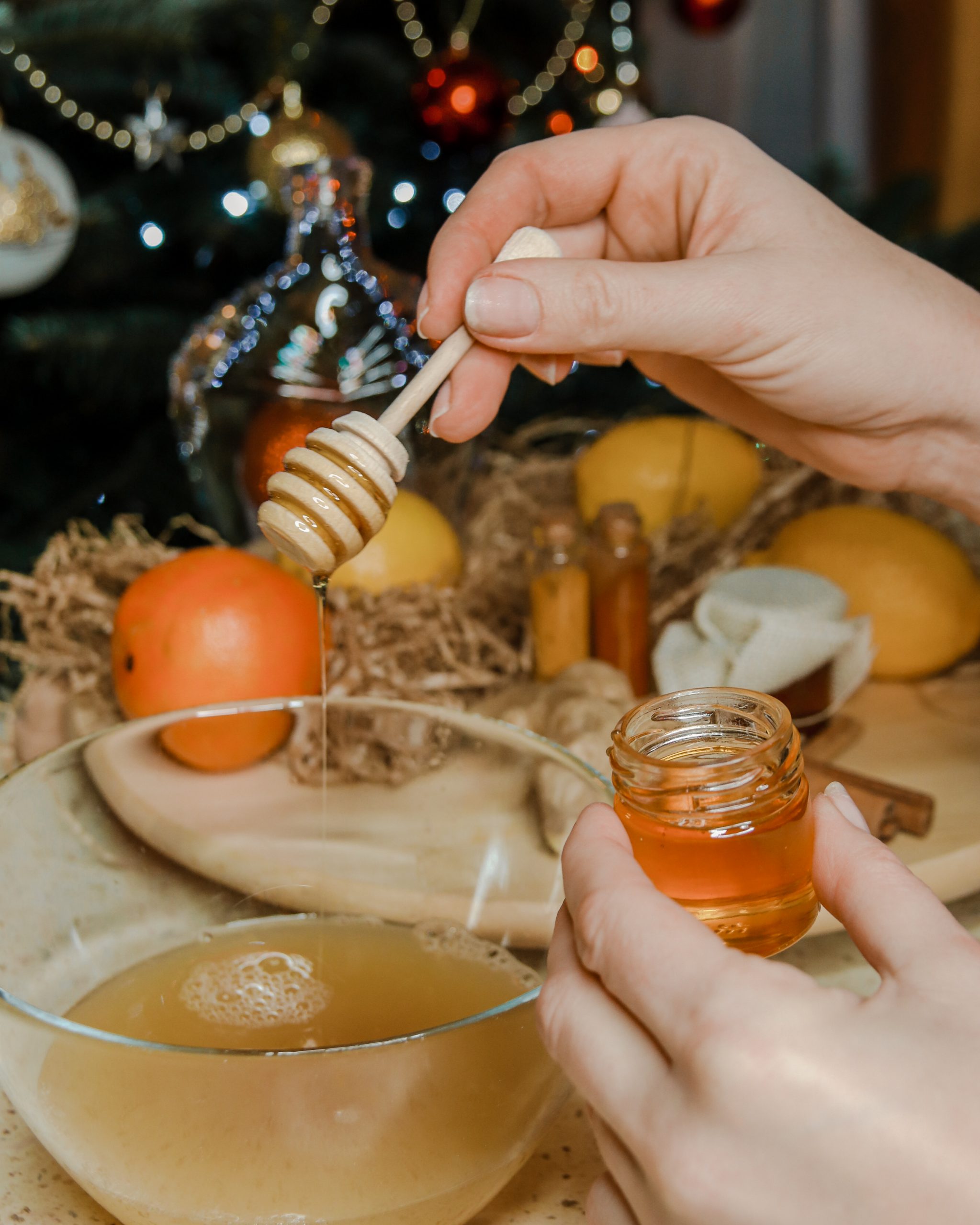 W między czasie wyciśnij sok z jednej cytryny oraz jednej (najlepiej słodkiej) pomarańczy. Gdy przygotowywany napar ostygnie, odcedź kawałki imbiru i dodaj pozostałe składniki, czyli: